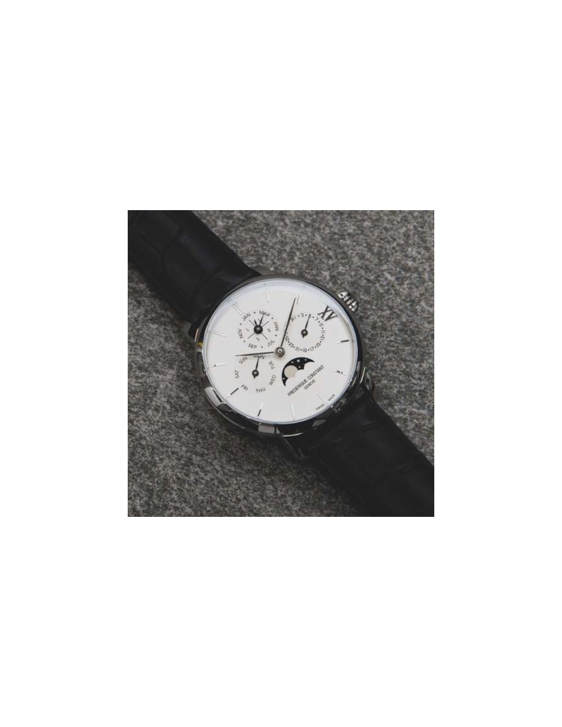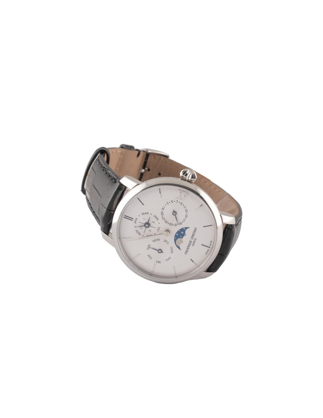 Le mouvement de la Slimline Manufacture Quantième Perpétuel de Frédérique Constant prend en compte les mois de différentes longueurs sur un cycle de quatre ans et peut donc gérer non seulement les mois de 28, 30 et 31 jours, mais aussi le 29e jour supplémentaire ajouté au mois de février des années bissextiles. Les indications correspondantes sont affichées clairement sur le cadran dans trois sous-compteurs: un pour le jour, un autre pour la date et un troisième, combiné, à 12 heures, pour le mois et l'année bissextile. A 6h, un guichet de phase de lune affiche le cycle lunaire qui est couplé avec l'affichage du calendrier perpétuel, ce qui signifie qu'aucune correction manuelle de la date n’est nécessaire avant le 1er mars 2100. Les indications peuvent néanmoins être réglées via les poussoirs dissimulés sur les côtés du boîtier.