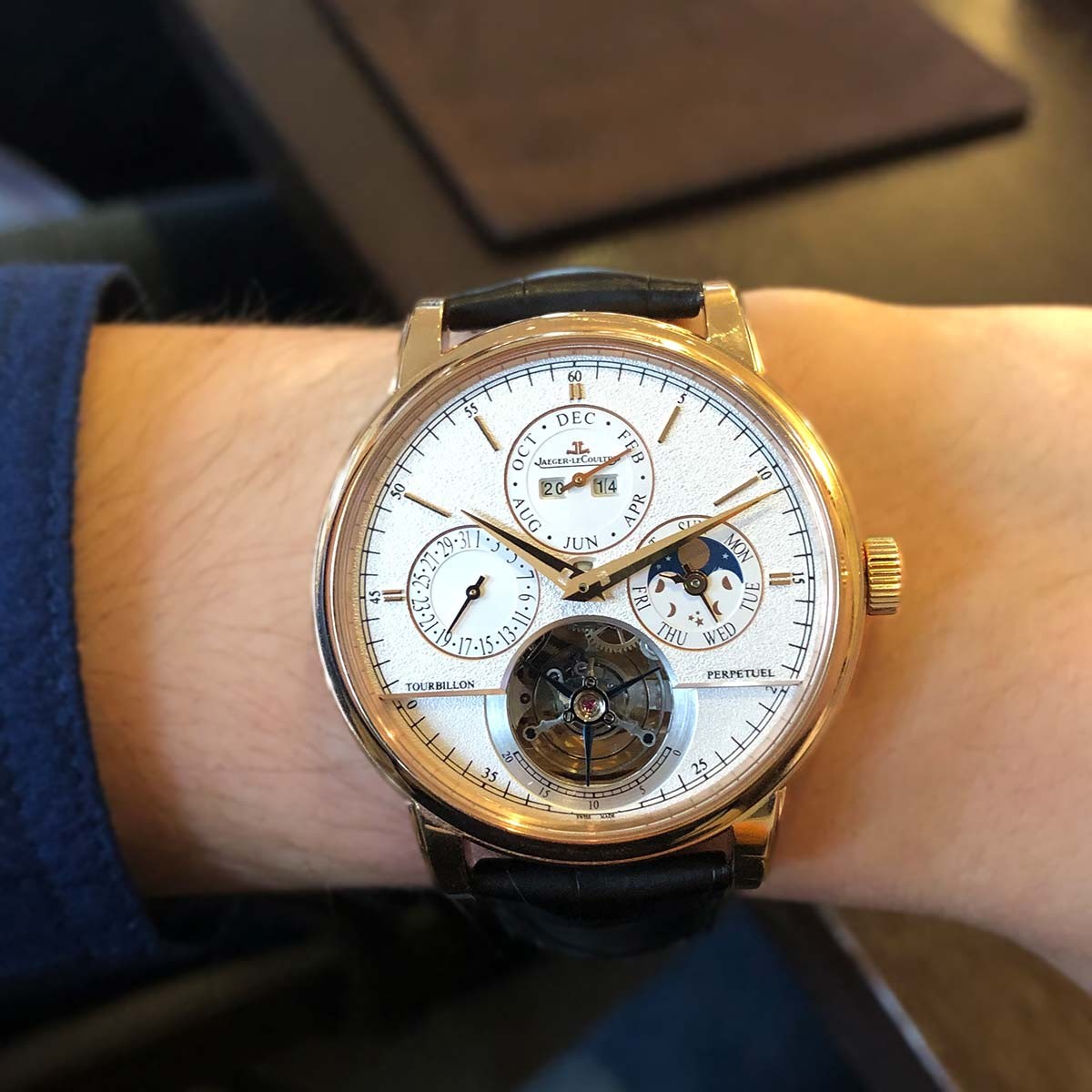 Inspirée des plus beaux garde-temps du XIXe siècle, la montre Master Grande Tradition Tourbillon Cylindrique à Quantième Perpétuel en or rose allie l’héritage historique de Jaeger-LeCoultre à son savoir-faire horloger le plus actuel. Une merveille de raffinement.